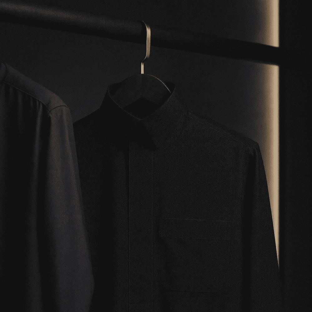 قماش رجالي فاخر بلون أسود ملكي أنيق، يتميز بملمس ناعم وانسيابية راقية، يمنح الثوب حضوراً كلاسيكياً جذاباً ولمسة فخامة تعكس الذوق الرفيع
